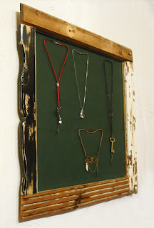 For decorative purposes, and to be 'in tune' with 1Unik's line of work, I added a frame made out of different wooden boards, all treated and varnised but proudly showing their lovely wear patina and age: two antique fragments of 19th Century door frames (the white and the rigged ones), a piece from a 30s cabinet (the top one) and a side board from a small table (the black one)The necklaces hang from rows of tiny headless nails, placed at different heights -for long and shorter models- Simple but effective!