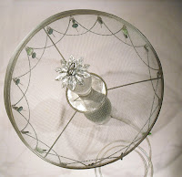 Testing the lamp: passed! And, finally, attaching the tin food cover to the shade ring (had to cut a teeny weeny bit off it so it would fit!) and mounting the strings of ball chain plus the glass bead pendants all around.