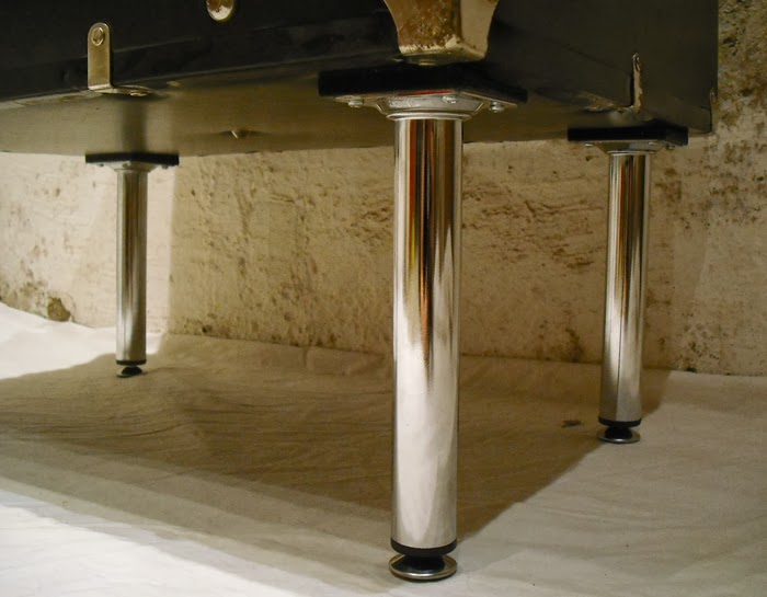 Attaching the chrome legs -and finally, placing the glass pane on silicone drops, plus securing it to the lid with metallic angles.