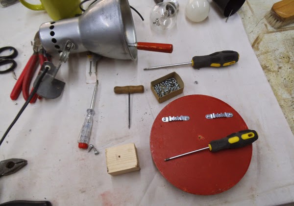 Here below, the main parts used to make the wall lamp. On the right, Matt lent us a hand with the vertical drill.