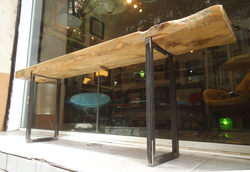 The legs, made out of square tube raw steel are embedded into the wood and then tightly secured with screws, leaving the the focus of attention to the beautiful surface of the wood, with its interesting grain and the remains of the original light green paint.