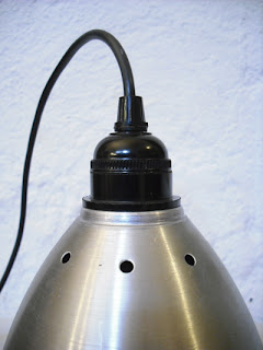 It is all made out of metallic parts: the aluminium shade of a vintage desk lamp, an enamelled ring (from unknown origin... maybe some kind of grill? its lid was used in the Wasp Lamp), four long screws and four cabinet catchs that hold both parts together, plus several small screws and bolts. The cord (1,6m long), bulb socket and cup are all black, and the wire connector is included.